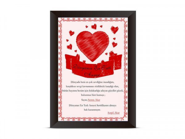 En Tatlı Anne Sertifikası a4 boyutlarında olup hem duvara asılabilmekte hem de masada ayakta durabilmektedir.