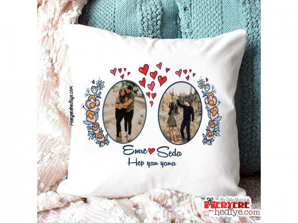 Sevgiliye Hediye Çiçekli Kalpli Fotoğraflı Yastık